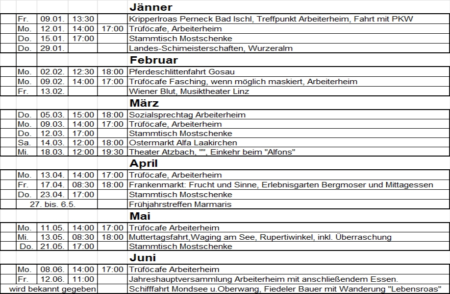Die Veranstaltungen / Aktivitäten als Monatskalender - bitte rechtzeitig anmelden