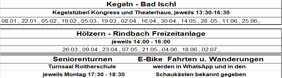 Ansprechpersonen und Termine für Turnen, Kegeln, Hölzern und Radfahren