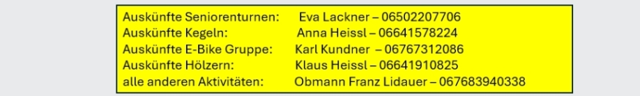 Ansprechpersonen und Termine für Turnen, Kegeln, Hölzern und Radfahren